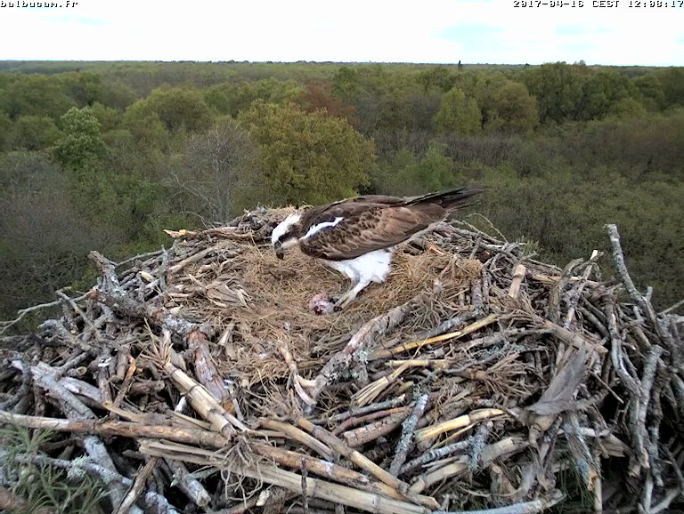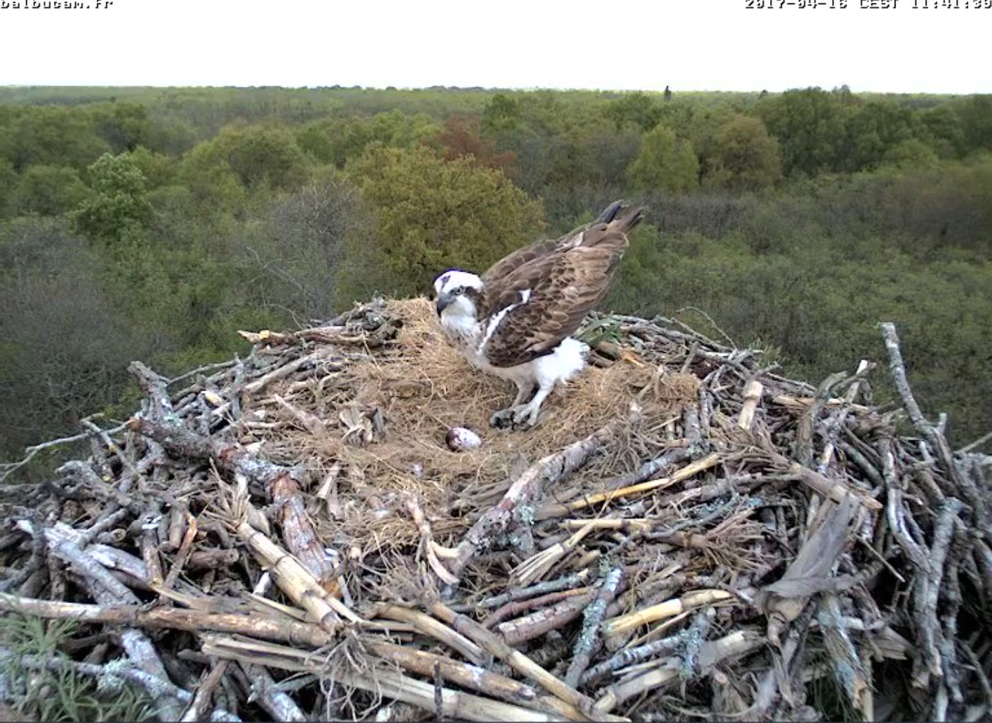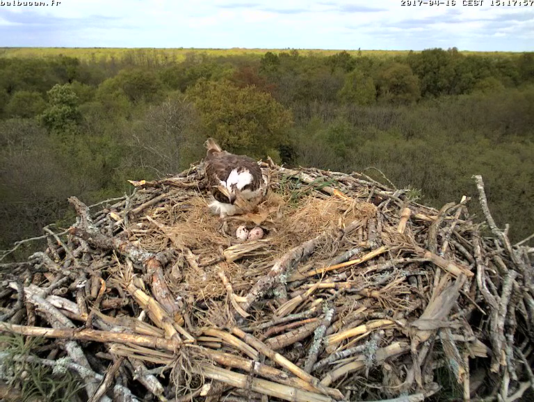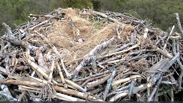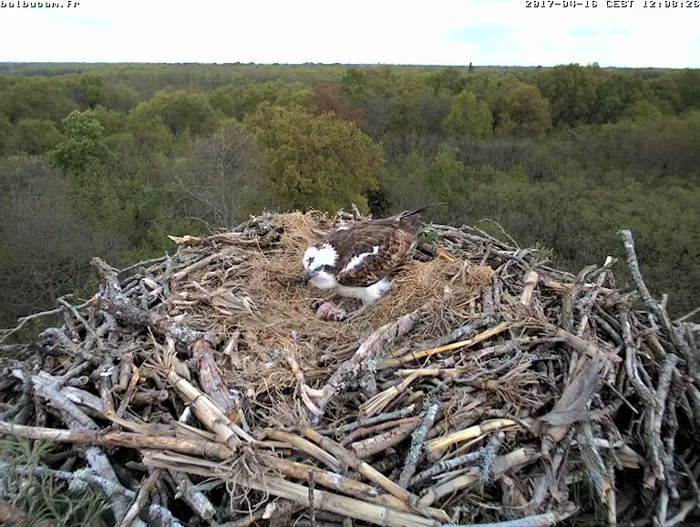 Soyez attentive et relisez mon « post » précédent : les œufs de Balbuzards sont toujours tachetés, et ces taches brun-rouge (selon la lumière évidemment) sont de tailles très variables. Cette grosse tache est visible depuis le début. Et sauf catastrophe, l’œuf ne sera brisé que vers le 21mai : peut-être en direct devant le public de la BalbuFête, qui sait !