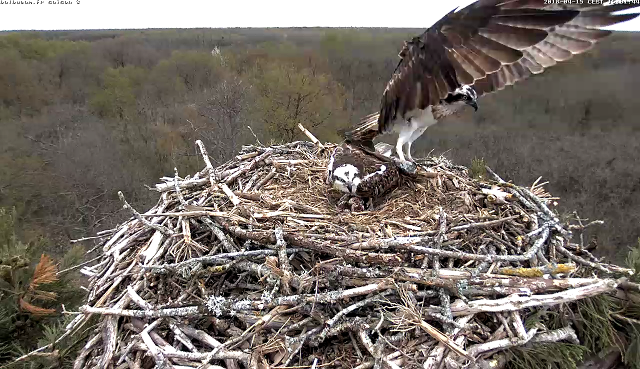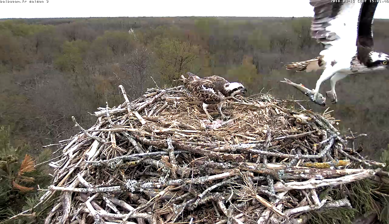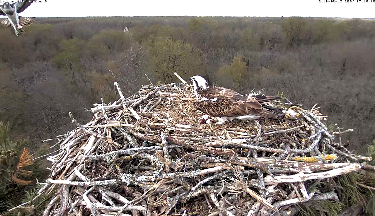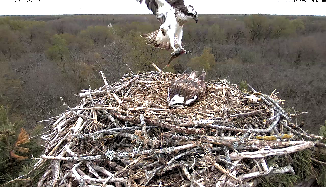 Concernant l’apport de poisson par un nouveau mâle, pas d’inquiétude mais il s’agit de jeunes oiseaux (probablement) en train de chercher à coloniser dans les environs ou à s’approprier cette aire (probablement un jeune issu d’ici ou des aires satellites). Le danger existe pour Sylva et Reda, seulement si ces fameux congénères de passages ou voleurs ou généreux poissonniers sèment la zizanie sur le nid. Ils déclenchent un chambardement dans la coupe des œufs, lors de joutes entre les deux mâles ou les 3 individus. Ou encore l’évincement possible de Reda en raison de l’expérience et l’âge de ce fameux visiteurs insistant.