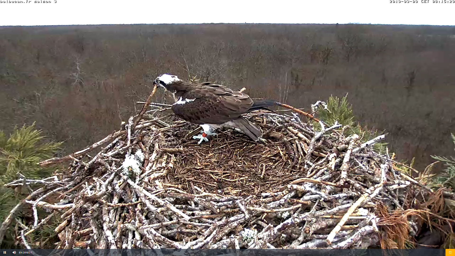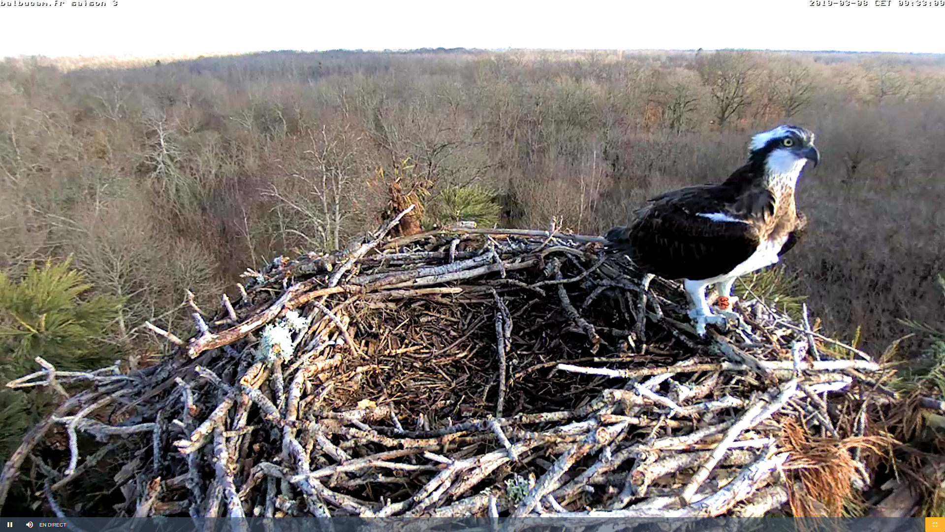 Ce matin à 9h20, pendant les deux heures d’ouverture de la caméra qui nous servent pour tester le fonctionnement, un beau Balbuzard est venu se poser sur l’aire pendant 13 minutes. Un inconnu bagué F.O (Bague rouge-orange 32 ou 32. tarse gauche).,, probablement jeune. …
