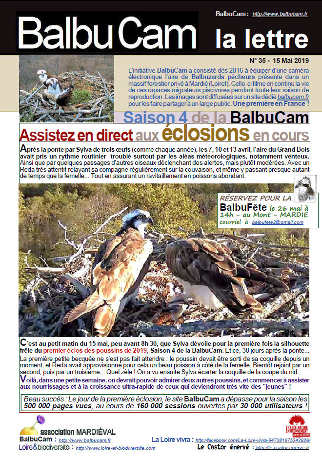 Je suis cette belle initiative depuis 3 ans et cette année avec encore plus d’assiduité. C’est une véritable addiction… L’année 2019 n’est en rien comparable à celle de 2018 où Reda n’avait pas vraiment assuré (nul n’en saura jamais les raisons). Là c’est un pur bonheur de voir évoluer ce magnifique couple avec une belle osmose. Sylva est incontestablement une mère courage capable d’affronter les pires intempéries (au risque de se faire éjecter de l’aire par un vent violent !!!). Reda est quant à lui un pêcheur hors pair capable d’apporter à sa compagne des prises hors normes. Il reste à espérer que dame nature nous donnera la satisfaction de voir les poussins devenir des juvéniles avec entrainement à l’envol et à la pêche… Les dimanches je vais aussi assez régulièrement au mont en vélo (depuis St Jean de Braye) pour voir si je n’aperçois pas Reda ou Sylva (ou même les deux quand la chance est de la partie) sur le grand épicéa malheureusement bien dégarni ou en vol au dessus de la Loire. Je suis souvent récompensée en retour et j’ai de plus eu l’occasion de rencontrer Jean-Marie avec qui j’ai échangé des propos enrichissants et que je remercie ici sans oublier toute l’équipe de modérateurs. Un grand bravo pour ces moments intenses que nous fait vivre la Balbucam et que la Loire vive sans ce maudit projet de pont.