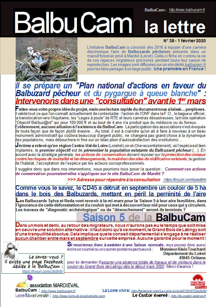 De tout coeur avec vous. J’adhère aujourd’hui à votre association pour vous soutenir. Je regarde la balbucam depuis plusieurs années et c’est un enchantement de voir vivre en direct ces magnifiques oiseaux. Ne lâchons rien, et unissons nos forces de persuasion.