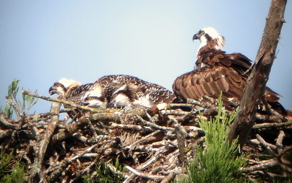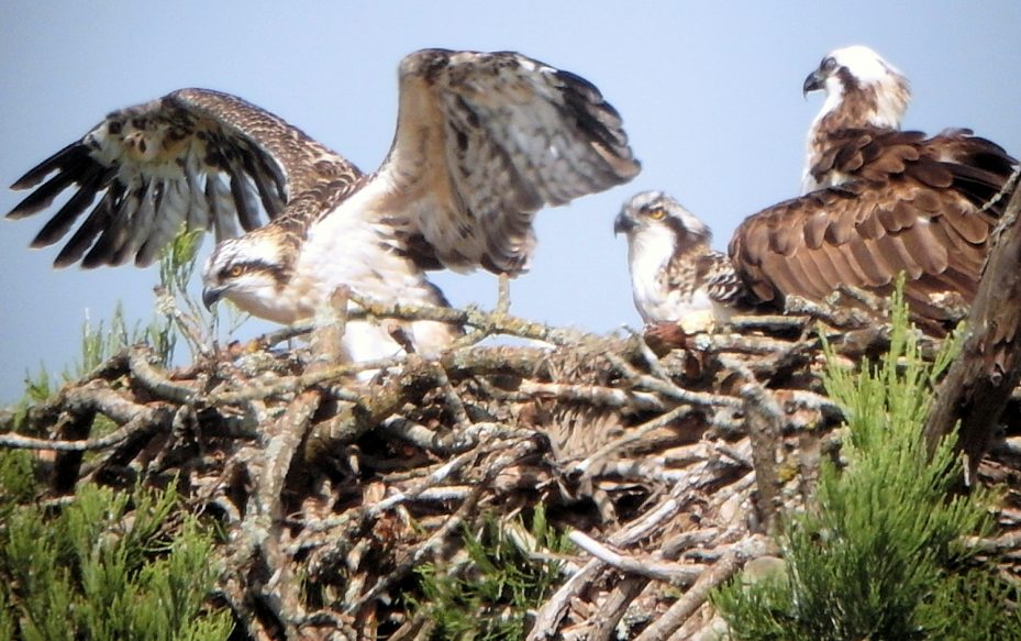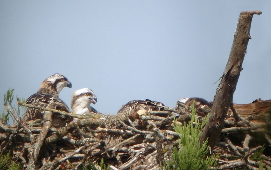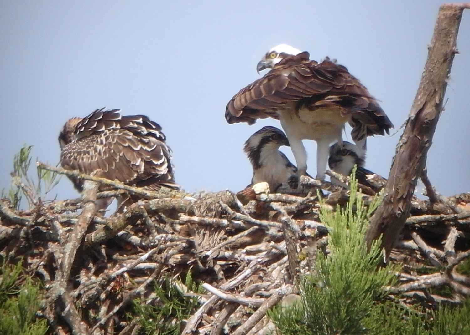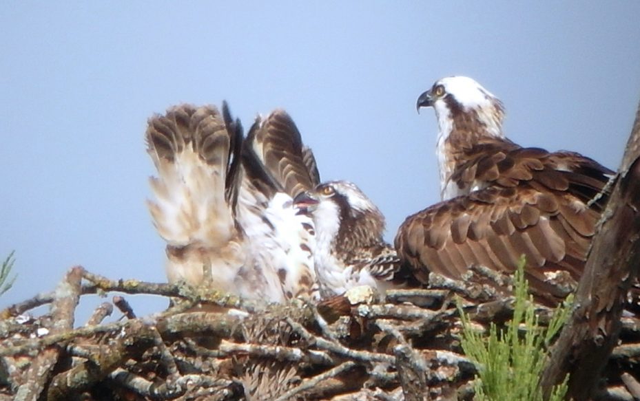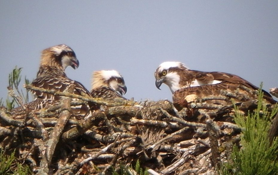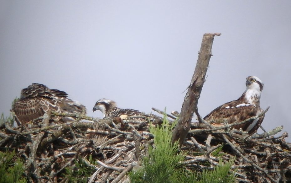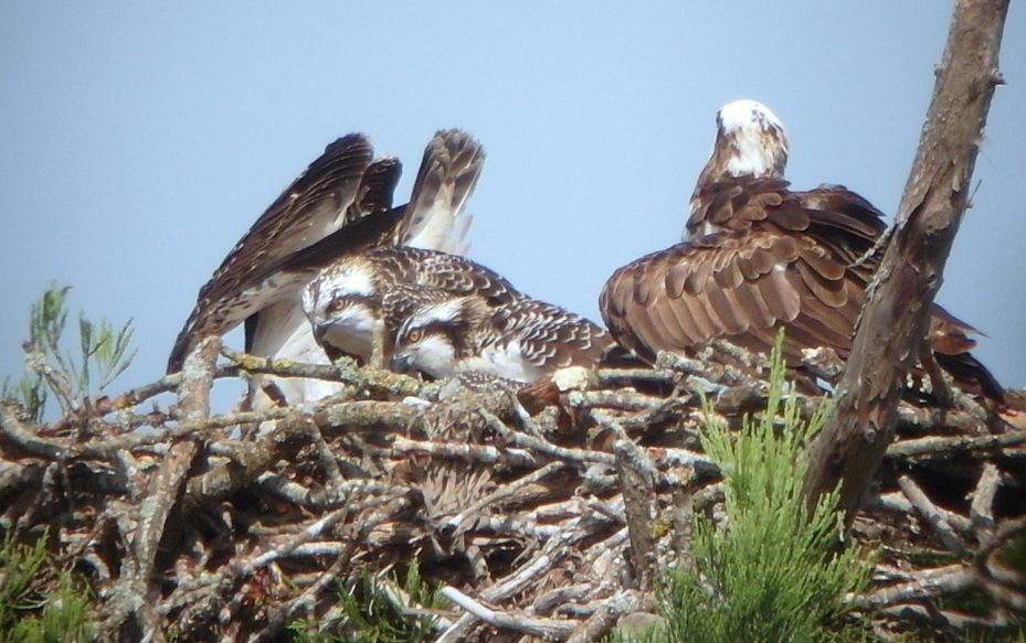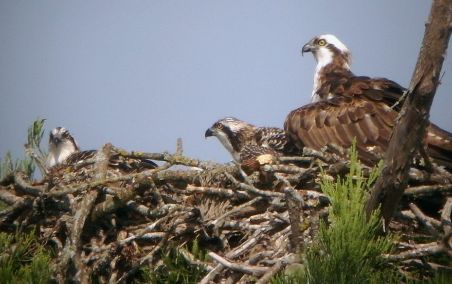 Sous l’œil distrait de Sylva, Lény et Jéry somnolent plus ou moins au fond du nid, tandis que Kali en équilibre sur le bord sud du nid contemple le vaste paysage.