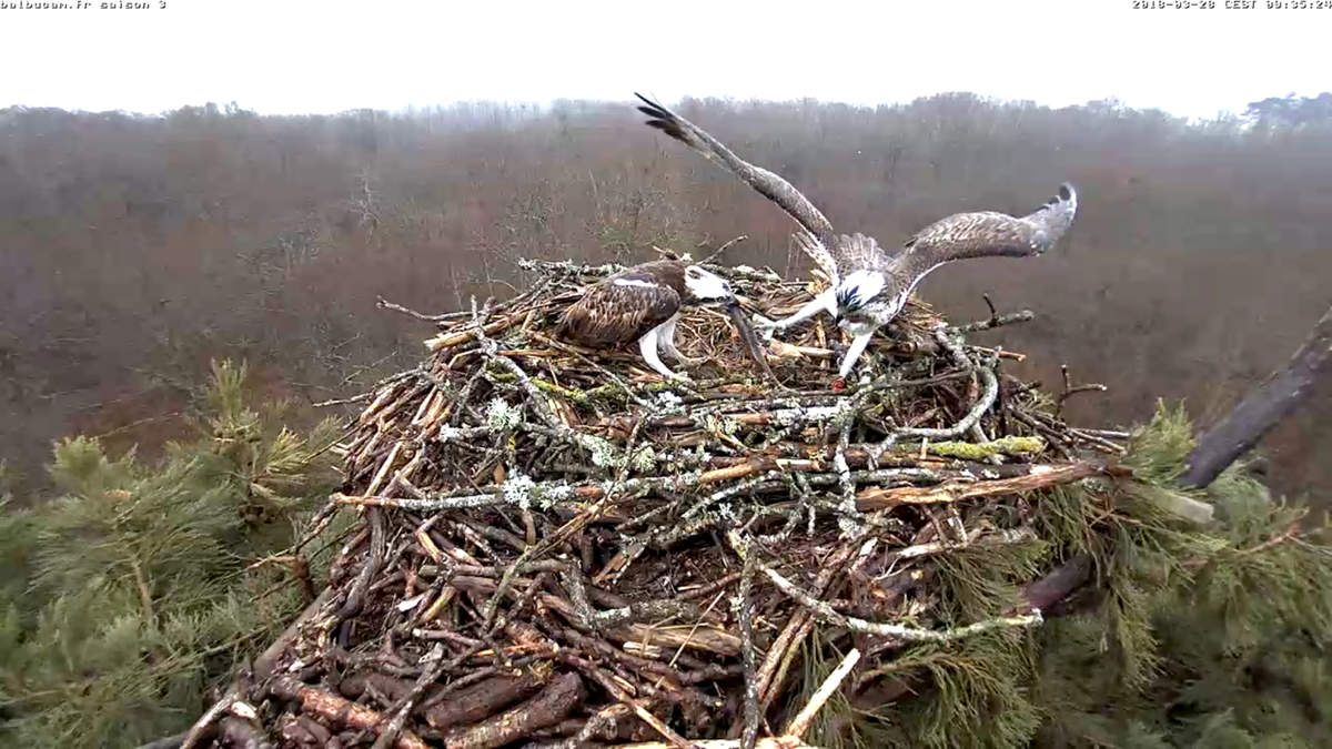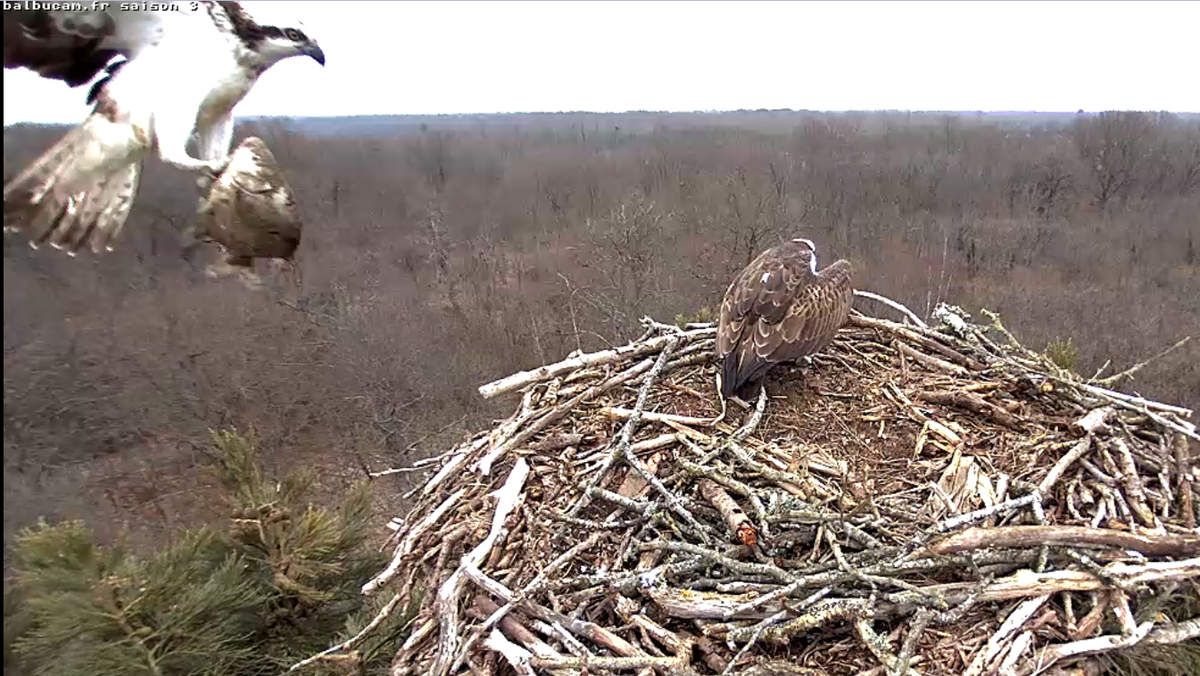 L’aire du Grand Bois a vu tranquillement le retour de la reine de l’aventure, puis celui de son jeune compagnon : alors que nous venions de mettre en ligne le « En direct » de la BalbuCam, et que nous y assistions à une tentative de « squatt » d’une tierce femelle contestée par au moins deux autres, Sylva a fait son apparition le 15 mars à 13 heures. Quelques minutes après, celle qui s’y était invitée avait abandonné l’aire. Et une demi-heure après, Sylva devait faire face à une ultime et spectaculaire provocation avant de reprendre la haute main sur l’installation.