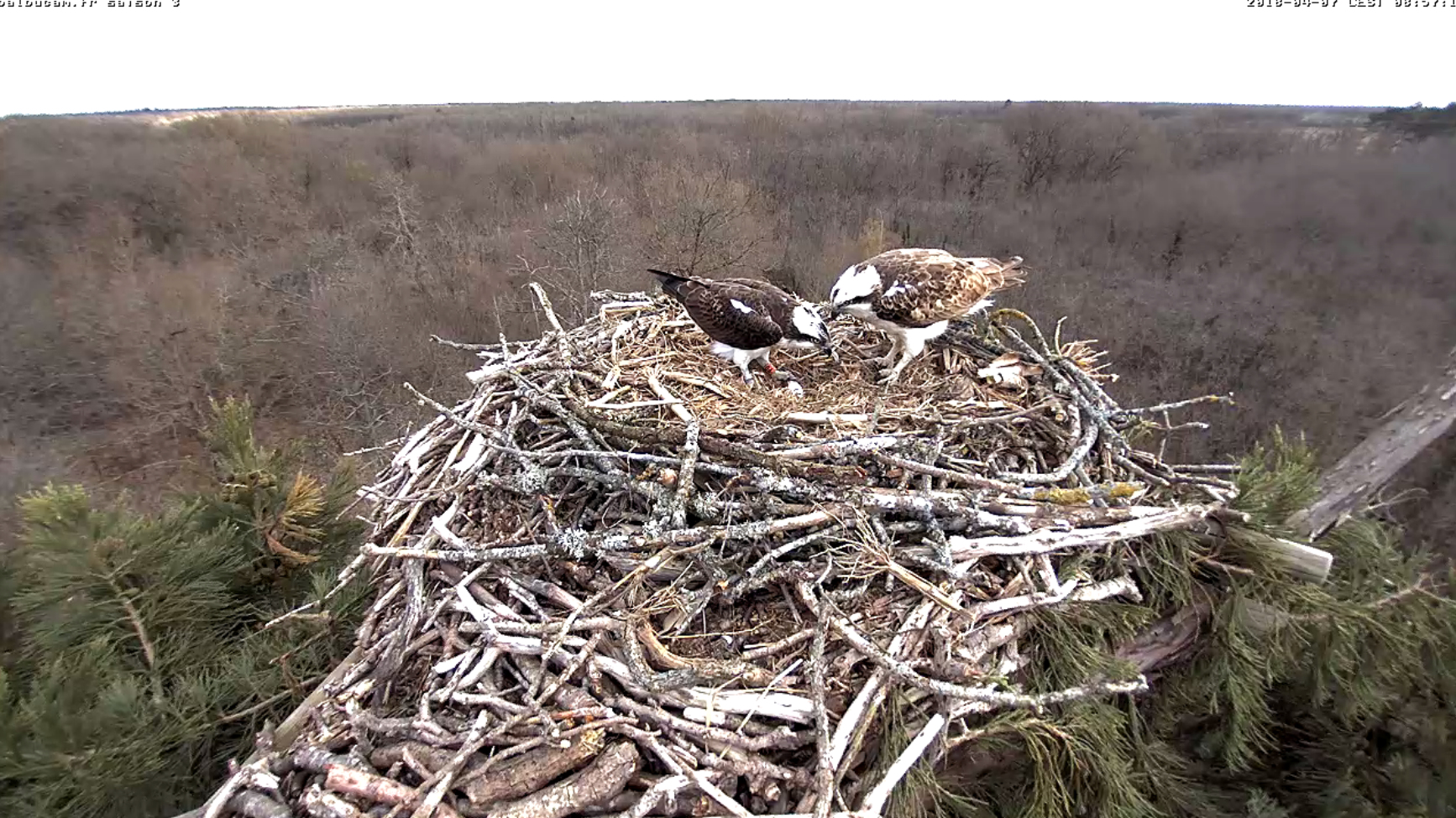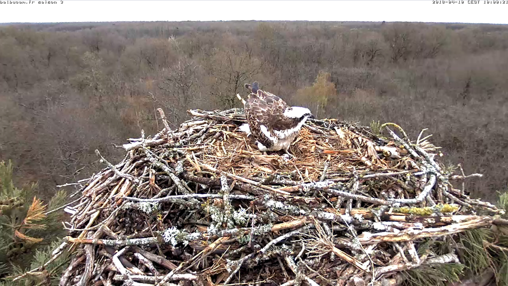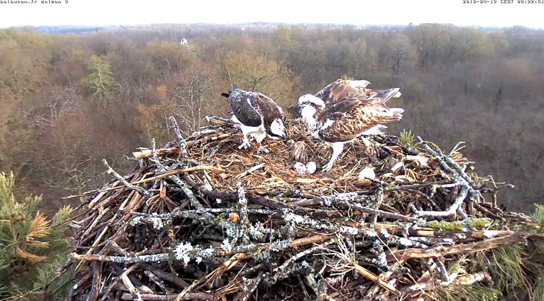 13 avril :Bon, on ne les voit pas forcément très bien ici… Même si la BalbuCam s’est rapprochée du nid pour une vision plus proche.