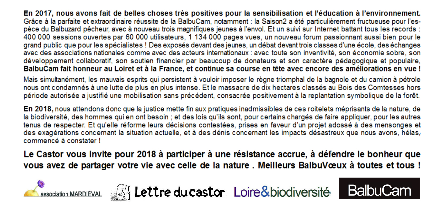 Meilleurs voeux à toute votre équipe qui fait un travail formidable et qui se bat pour conserver cette merveilleuse nature afin que , nos petits enfants puissent connaitre et admirer la faune sauvage . Les nouvelles, concernant l’arrêt du déboisement à St Denis de l’Hotel, sont plutôt rassurantes . Le tribunal a tranché et c’est une victoire contre toute les destructions à l’aveugle . Sylva va pouvoir retrouver , dans quelques semaines , sa résidence de printemps-été dans le haut de son séquoia pour le bonheur de tous