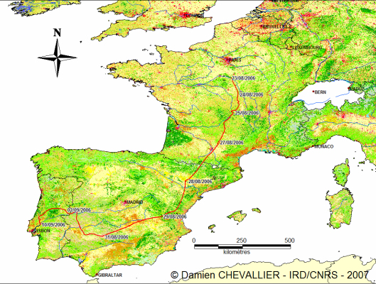 Après avoir parcouru quelques km plein Est, où il fréquente pendant quelques jours un étang forestier, l’oiseau a vraiment commencé sa migration le 24 août, avant ses parents. Le 27 août, après avoir parcouru près de 300 km durant cette seule journée, il rejoint l’Espagne et passe la nuit auprès du Rio Cinca, en Aragon. Les jours suivants, la trajectoire sud-ouest, vers le détroit de Gibraltar, laisser présager le franchissement de la méditerranée. Contre toute attente, un changement de direction, difficile à expliquer, a lieu le 1 septembre. L’oiseau remonte vers le nord-est avant de franchir la frontière portugaise et d’atteindre les bords du Tage, où il a pu être photographié par un ornithologue portugais (José Viana – Photo ci-dessus à droite). Ce sera finalement le lieu d’hivernage choisi.